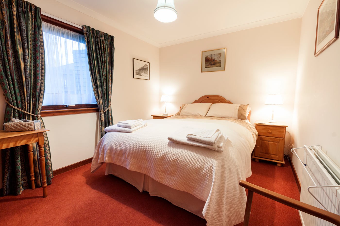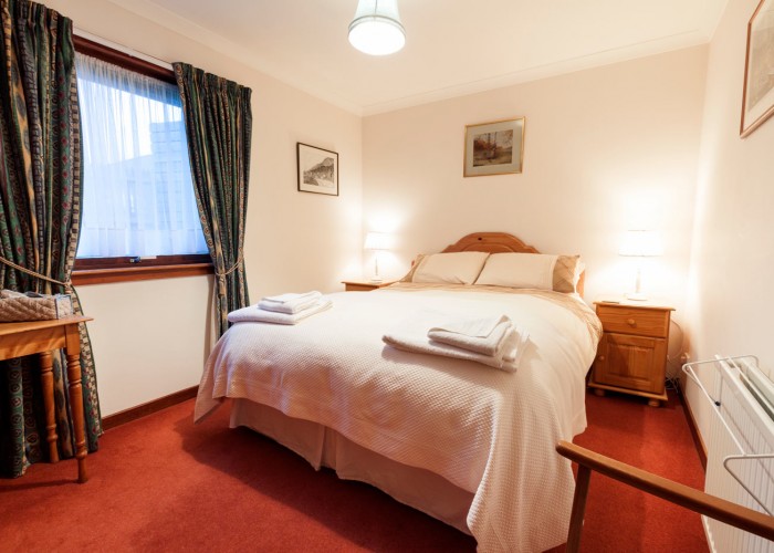 offers a king size double bed. Simply decorated but pretty, there are bed side cabinets with lamps at each side.